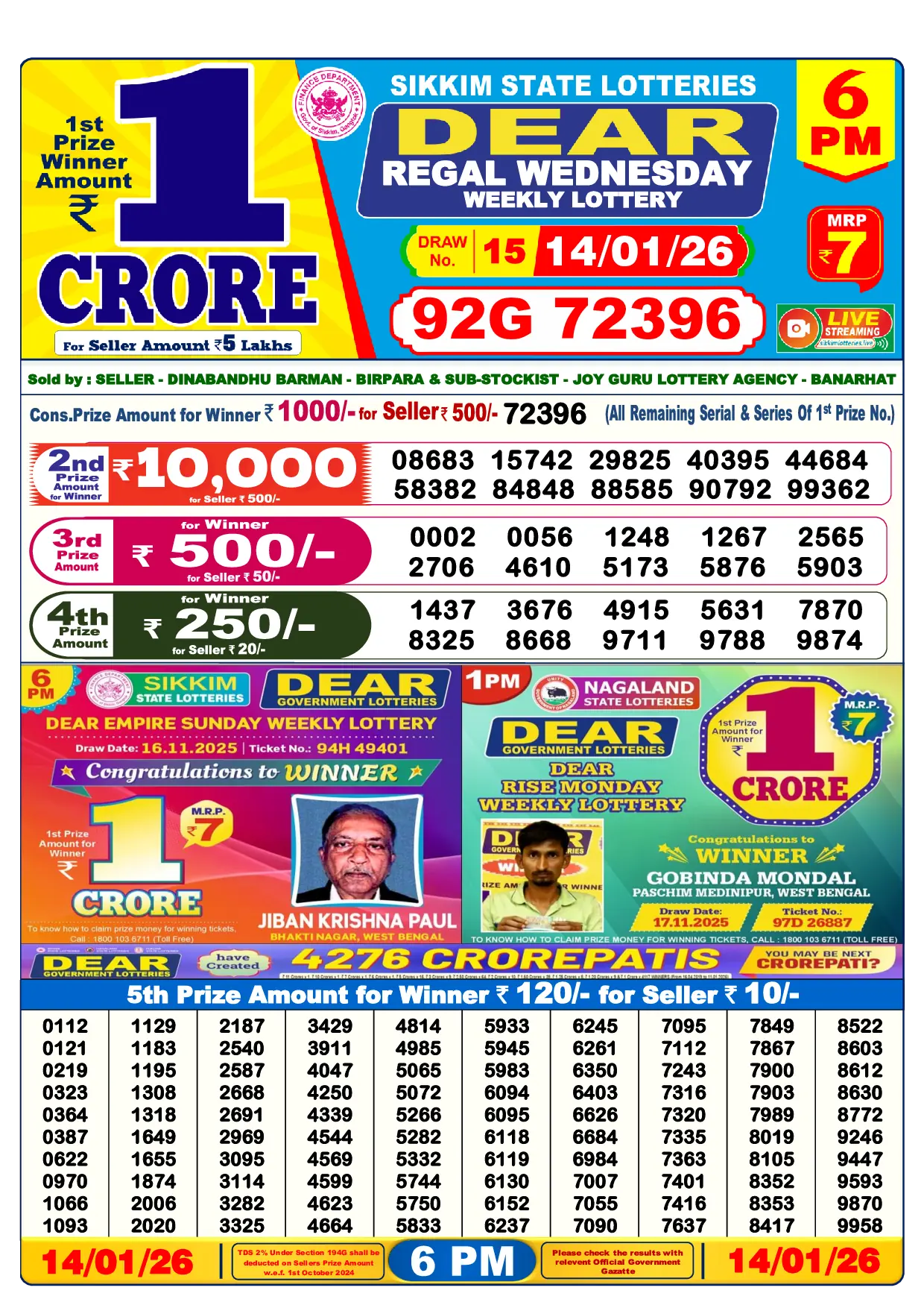 The 6 PM Evening Draw of Lottery Sambad for today, 14 January 2026, is conducted by the Nagaland State Lottery. As soon as the draw is completed, the officially declared winning numbers are released.